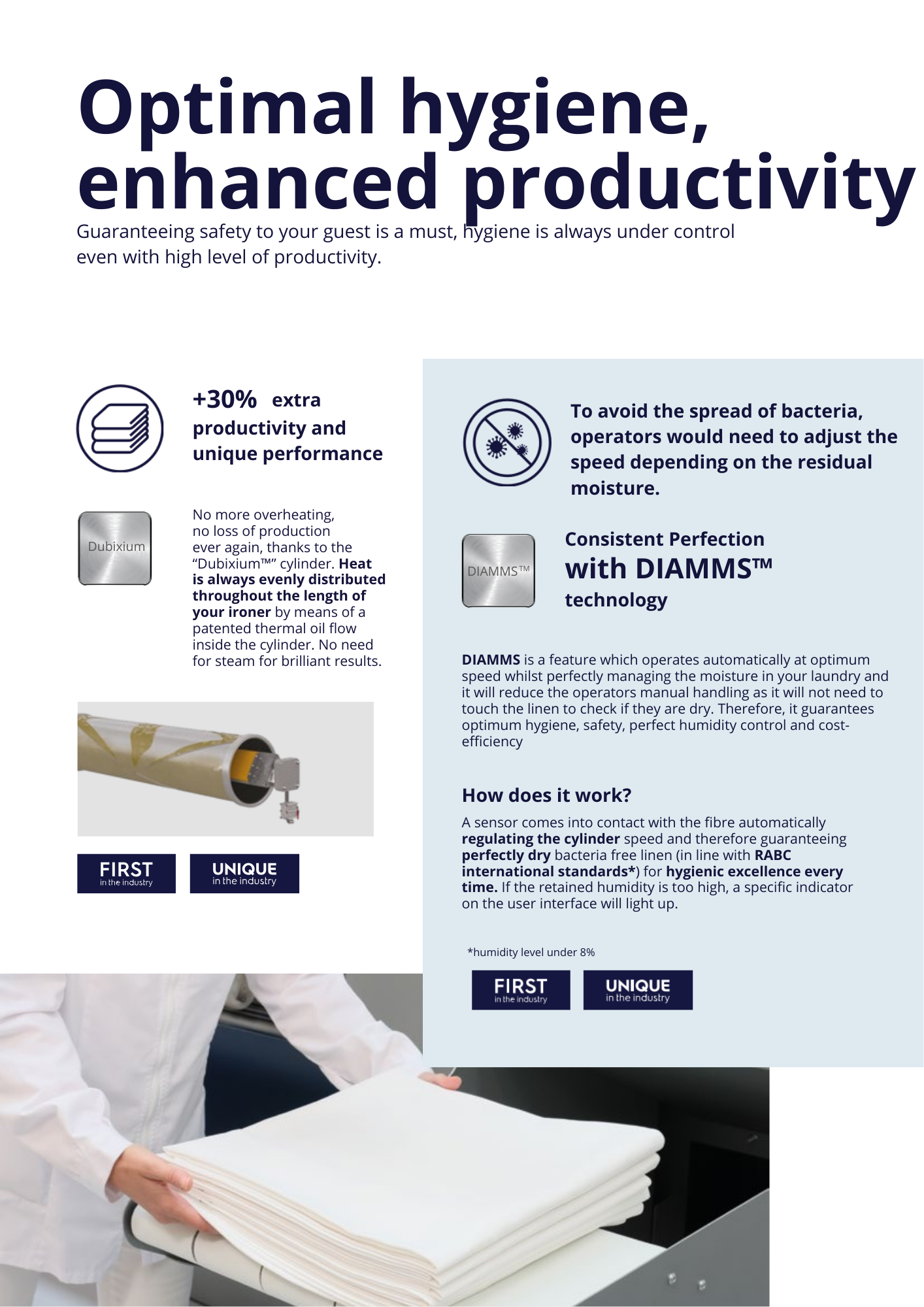 Hygiene Guard, in synergy whith DIAMMS, will reject linens automatically if they do not comply with the prescribed humidity parameters set by the RABC standards.